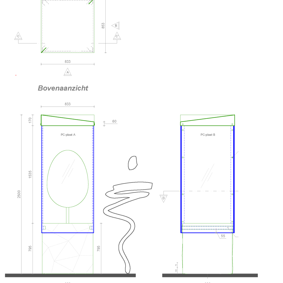 De unieke showcase is een ontwerp van Joep Verheijen. De basis bestaat uit een bak van gegoten beton. De vitrine zelf is gemaakt van onverwoestbaar polycarbonaat met een speciale coating die het geheel beschermt tegen krassen en ander onheil van buitenaf. De vitrine is alleen met speciaal gereedschap te openen. De inhoud is dus maximaal beschermd. Het dak van de showcase is gevormd uit gemoffeld en gezet staal van 1,5 mm dikte en is gespoten in de kleur RAL 7073.